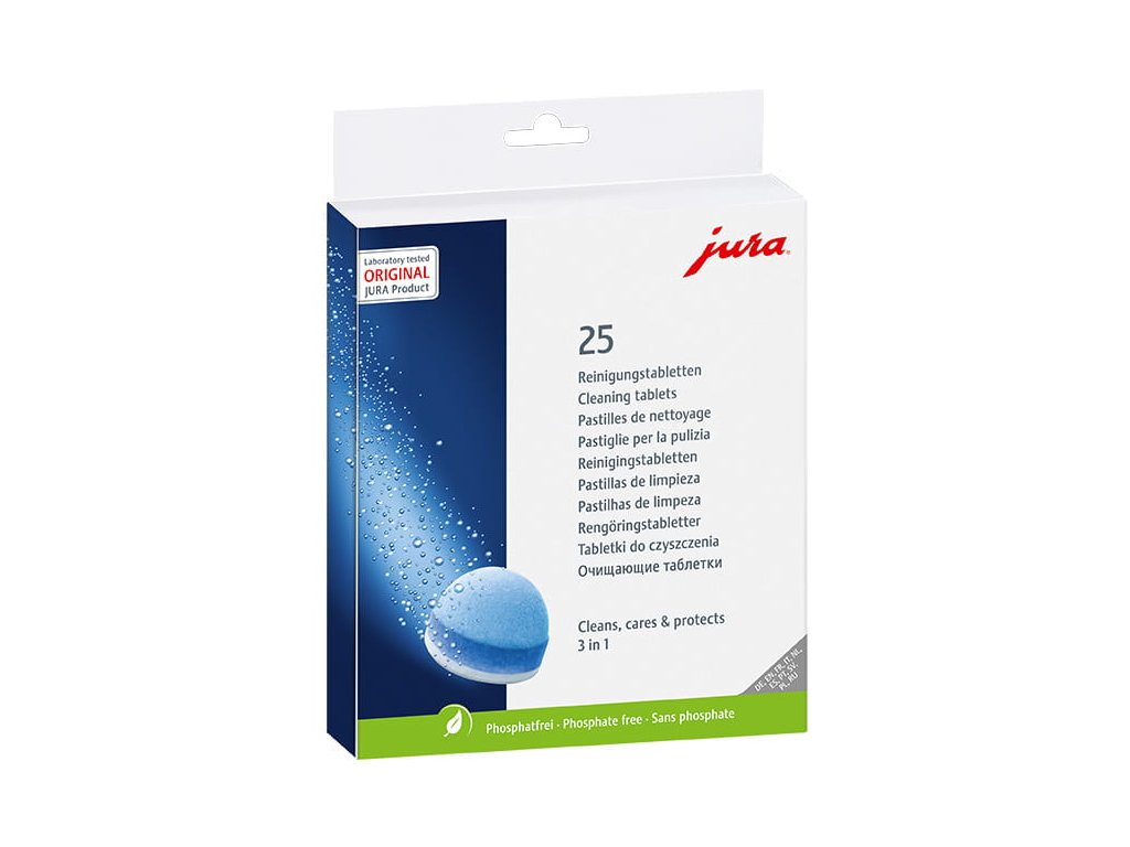 Náš výzkumný tým vyvinul vynikající čistící tablety. Jejich intenzivní účinnost spočívá v tom, že je jejich čistící a ochranný účinek obrovsky posílen. Nová 2 fázová čistící tableta kávovar nejen vyčistí, ale také zamezí hromadění mastnoty z kávových zbytků.