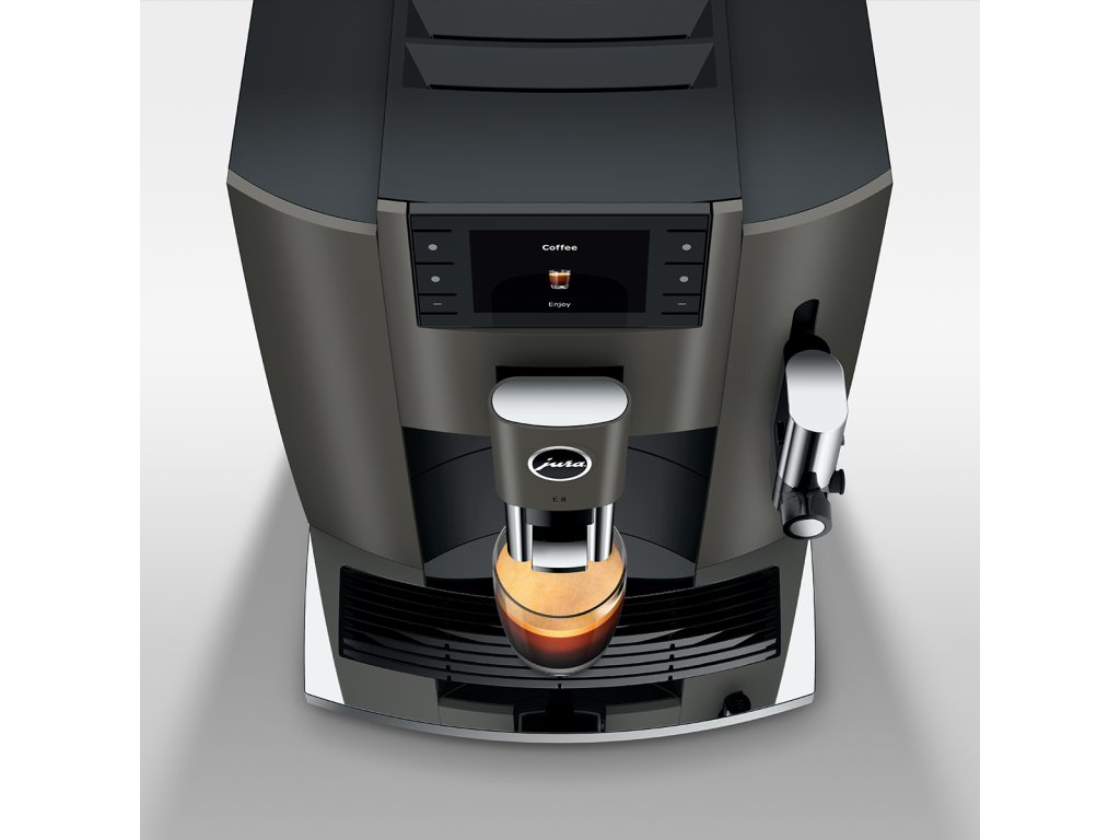 Při dalším vývoji klade JURA mimořádný důraz na design. Kávovar E8 má vysokou rozpoznávací hodnotu, vyznačuje se smyslem pro detail, použitím vysoce kvalitních materiálů a vysokou přesností zpracování. Moderní štíhlý vzhled se vyznačuje harmonicky symetrickými liniemi. Jasné, minimalistické tvary s cíleně umístěnými akcenty dodávají kávovaru strukturu a charakter. Design modelu E8 má ty nejlepší předpoklady k tomu, aby i po mnoha letech působil stále svěžím a moderním dojmem.