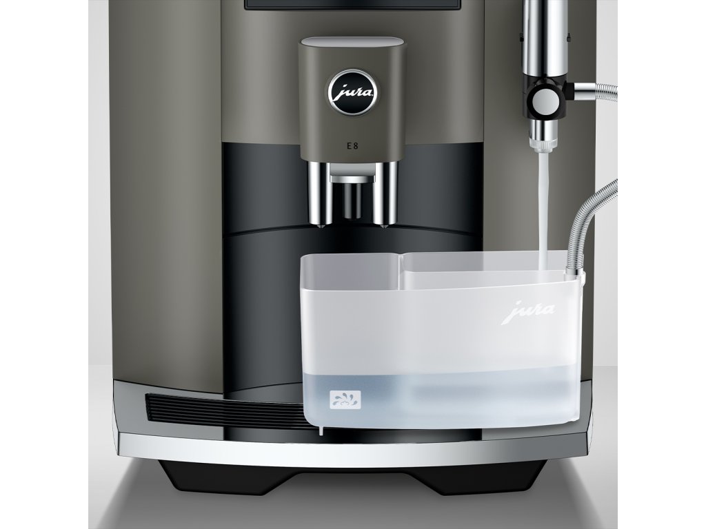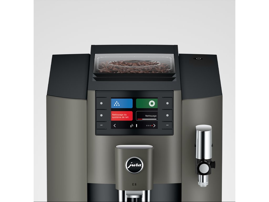 Na velkém 3,5" displeji lemovaném šesti ovládacími tlačítky je obzvláště snadné procházet všemi funkcemi. Díky jasným obrázkům a grafům lze intuitivně využívat rozmanité možnosti modelu E8. Nastavení všech specialit a jejich individuální umístění na obrazovce je možné libovolně přizpůsobit a názvy produktů skrýt nebo zobrazit. Relevantní informace jsou přehledně zobrazeny v Cockpitu. Ke snadné údržbě přispívá čištění systému rozvodu mléka pomocí funkce One-Touch, které automaticky zajišťuje dokonalou hygienu jediným stisknutím tlačítka.