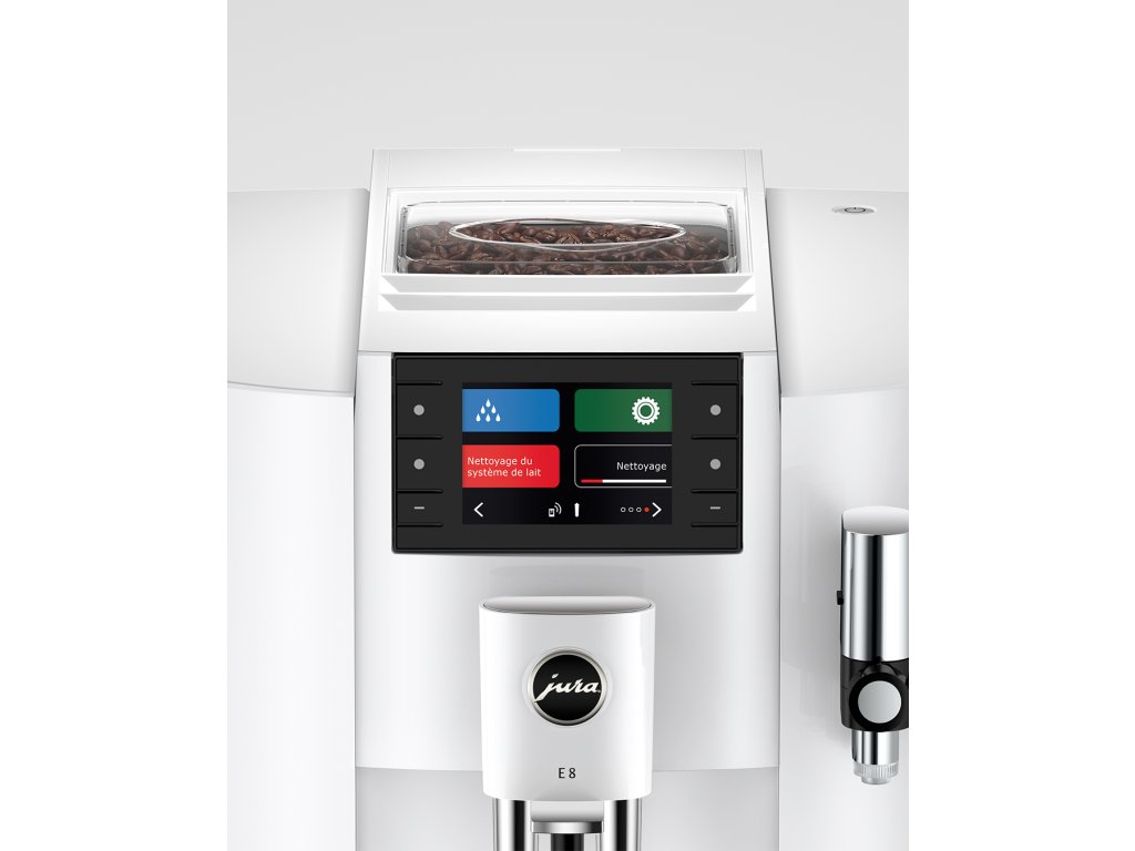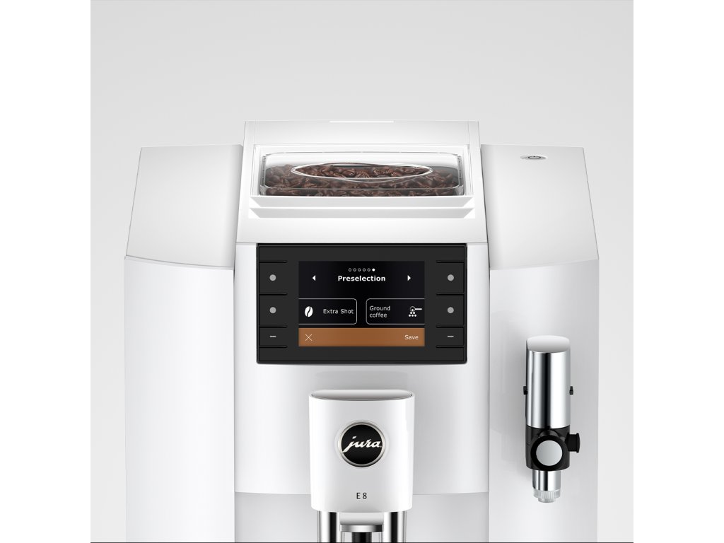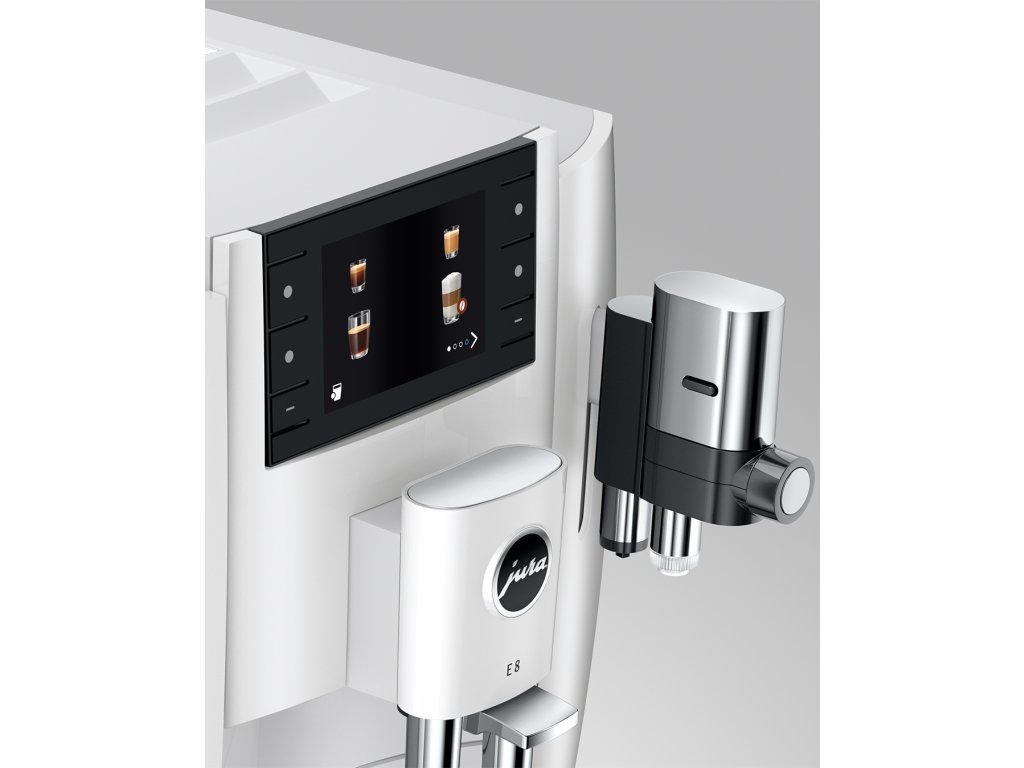 Na velkém 3,5" displeji lemovaném šesti ovládacími tlačítky je obzvláště snadné procházet všemi funkcemi. Díky jasným obrázkům a grafům lze intuitivně využívat rozmanité možnosti modelu E8. Nastavení všech specialit a jejich individuální umístění na obrazovce je možné libovolně přizpůsobit a názvy produktů skrýt nebo zobrazit. Relevantní informace jsou přehledně zobrazeny v Cockpitu. Ke snadné údržbě přispívá čištění systému rozvodu mléka pomocí funkce One-Touch, které automaticky zajišťuje dokonalou hygienu jediným stisknutím tlačítka.