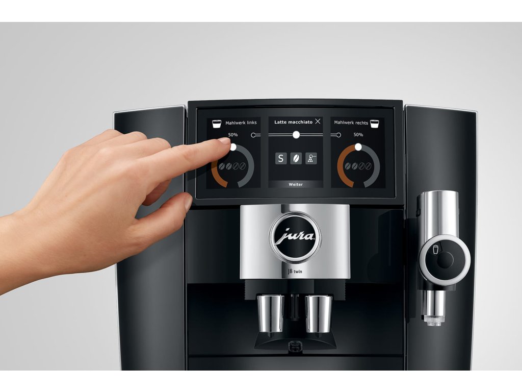 Panorama Coffee Panel umožňuje intuitivní využití veškerých výhod kávovaru J8 twin. Filozofie obsluhy je intuitivní a logická. S posuvníky nabízí Easy Mode maximální flexibilitu při nastavování kávových specialit preferovaným šálkům. Další usnadnění ovládání přinášejí asistenční systémy. Kontrola aroma je zárukou správné jemnosti mletí. Inteligentní snímač šálku, tzv. Coffee Eye, zajišťuje, že šálky jsou vždy umístěny pod správnou trysku v závislosti na vybrané specialitě. Samozřejmostí je čištění a péče jediným stisknutím tlačítka.