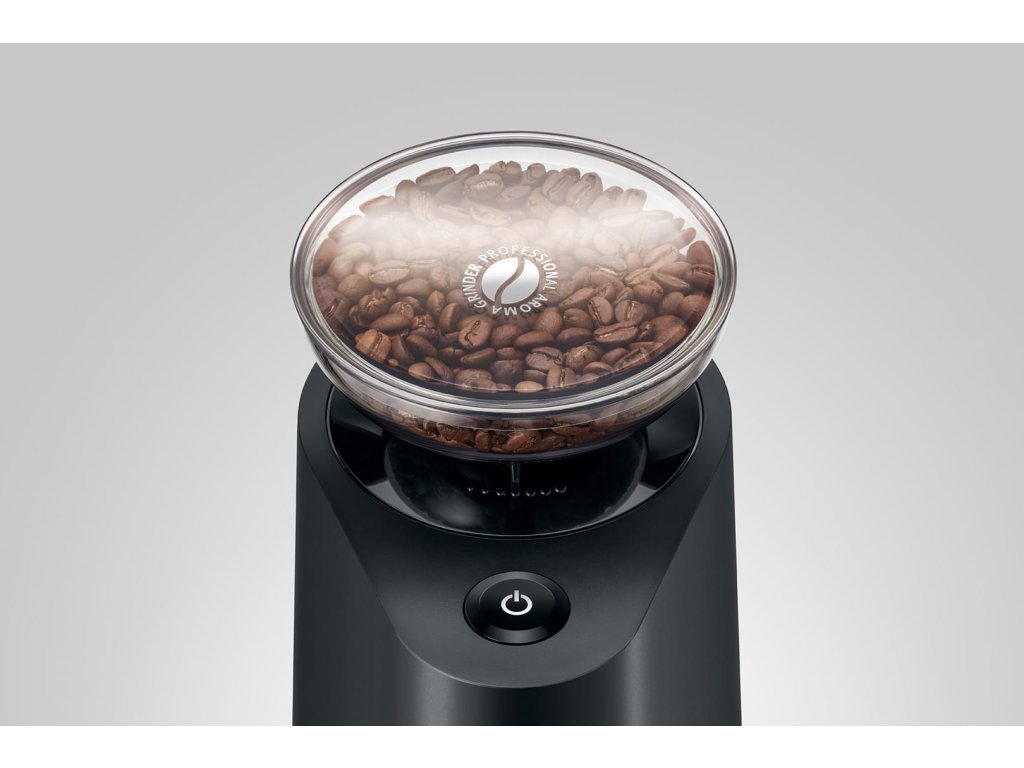 Ovládání nemůže být jednodušší: k tomu, aby mlýnek na kávu začal přesně pracovat, stačí stisknout ergonomicky tvarované tlačítko. Mlýnek se zastaví, jakmile se tlačítko zase uvolní. V praktické skleněné odměrce na kávu je množství mleté kávy dobře odečitatelné.