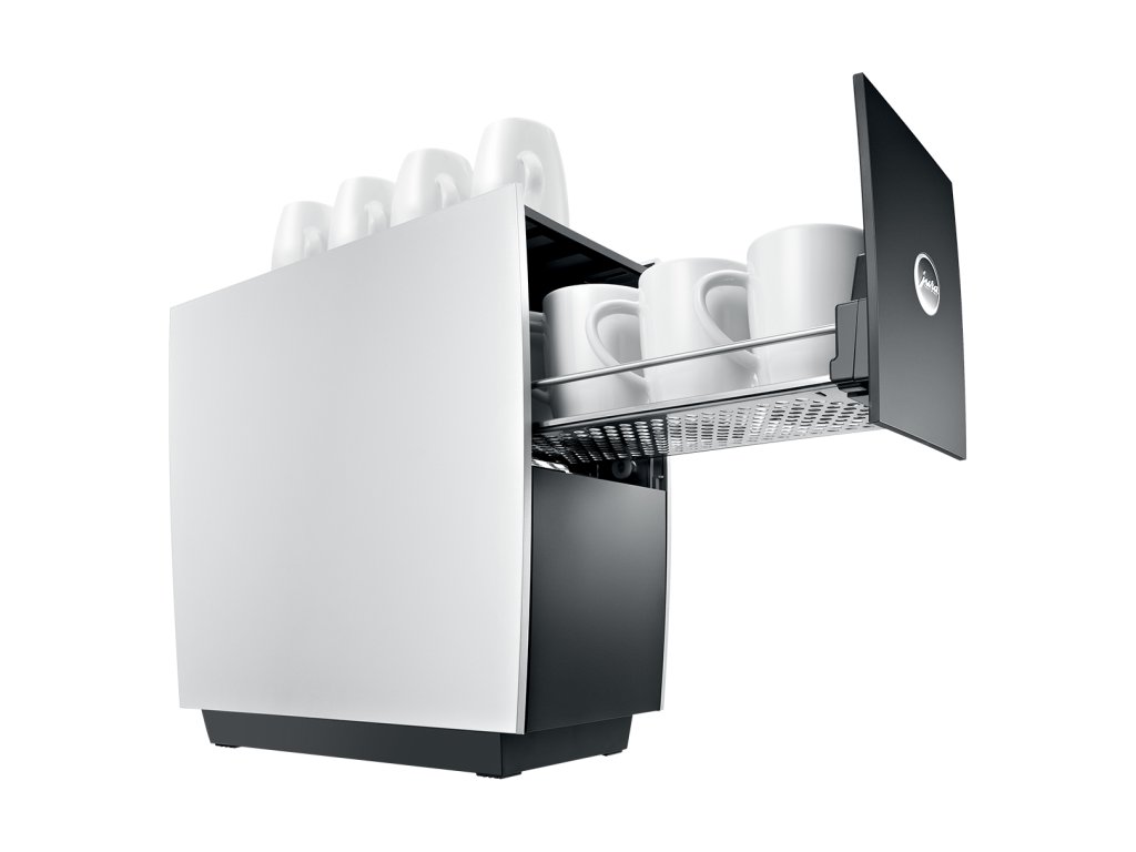 Dvě topná tělesa udržují šálky uvnitř při konstantní teplotě okolo 55 °C – ideální pro přípravu všech káv od ohnivého espressa až po cappuccino korunované mléčnou pěnou. Ohřívač šálků má také pasivně vyhřívaný hliníkový zásobník na své horní části.